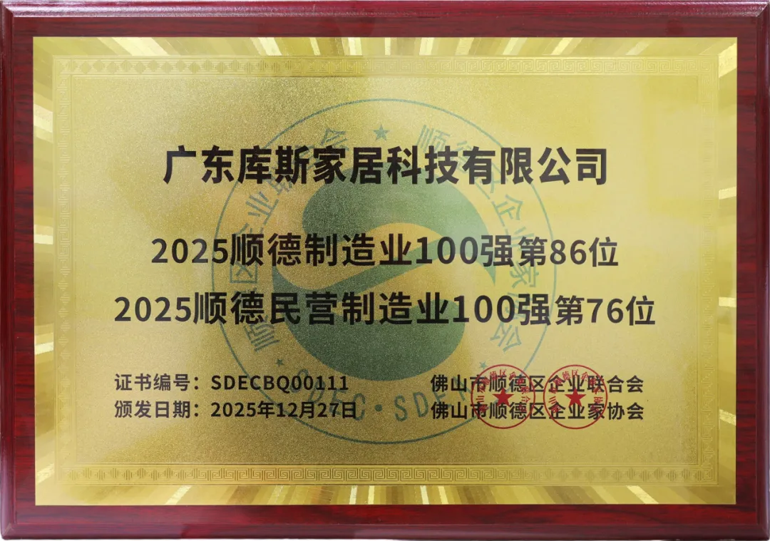 智造实力再获认可!库斯家居荣登2025年顺德制造业双百强榜单