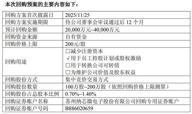 11月24日晚间,纳芯微(688052)发布公告,公司计划以集中竞价交易方式回购股份,回购金额不低于 2亿元,不超过4亿元,回购价格上限为200元/股,预计回购数量为100万股至200万股,占总股本的 0.70%至1.40%。 公司于2022年4月登陆科创板,其IPO时发行价为230元/股,当时被媒体称为"超募之王"。公司上市不久 后股价一度涨至331.03元/股,创历史新高。然而,纳芯微A股股价自2022年8月开始了震荡下行,并在 2024年4月盘中触及78.09元/股的历史低点。2024年,公司股价较长时间处于"破发"状态。 截至2025年11月24日收盘,纳芯微A股股价报144.98元/股,200元/股的回购价格上限比市价高出 37.95%。 业绩方面,公司收入呈现波动上升态势。2022年~2024年,纳芯微的营业收入分别为16.70亿元、13.11 亿元和19.60亿元。归母净利润分别为2.51亿元、-3.05亿元和-4.03亿元;公司毛利率分别为48.50%、 33.90%和28.00%。 此外,纳芯微已于2025年11月18日通过港交所聆讯,正式启动"A+H"上市进程。此次IPO拟发行不超过 40 ...