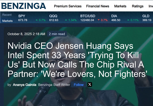 【环球网科技综合报道】10月9日消息,据Benzinga报道,英伟达CEO黄仁勋近日在一档电视访谈节目 中,回顾了英伟达与英特尔的竞争历程,并重点谈及双方如今的战略合作关系。 黄仁勋在访谈中首先提及两家企业漫长的竞争历史,他以略带幽默的口吻表示:"他们(英特尔)花了 33 年时间试图在市场中与我们竞争。" 这番表述既道出了过往行业竞争的激烈,也为后续谈及合作埋下 伏笔。 来源:环球网 如今,这对曾长期处于竞争状态的科技企业已正式转变为战略盟友。今年 9 月,双方达成一项价值 50 亿美元(按当前汇率计算,约合 356.72 亿元人民币)的合作协议,将围绕超大规模数据中心、企业级 及消费级市场,联合开发定制芯片产品。对于这一合作转变,黄仁勋形象地比喻道:"我们是恋人,不 是对手",生动诠释了两家企业从竞争走向协同的战略调整。 谈及此次合作的促成因素,黄仁勋指出,他与英特尔现任首席执行官陈立武的长期友谊是重要基础,而 更深层的动力则源于市场发展需求。在快速变化的人工智能硬件市场中,双方意识到通过合作可整合各 自优势、实现共同利益,最终达成 "双赢" 格局。据介绍,此次合作将推动两款新产品的研发,借助英 伟达在 A ...