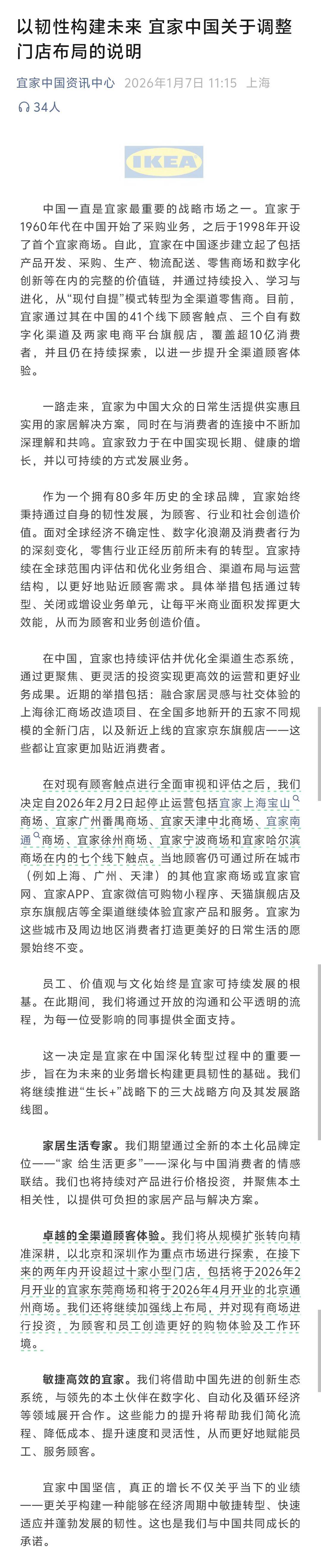 1月7日,宜家中国在"宜家中国咨询中心"官方公号平台发布《宜家中国关于调整门店布局的说明》,在 对现有顾客触点进行全面审视和评估之后,决定自2026年2月2日起停止运营包括宜家上海宝山商场、宜 家广州番禺商场、宜家天津中北商场、宜家南通商场、宜家徐州商场、宜家宁波商场和宜家哈尔滨商场 在内的七个线下触点,"已确保同城或周边消费者可通过其他门店及线上渠道继续获得服务。" 对此调整,宜家中国相关方面对《中国经营报》记者表示:此次调整并非意味相关门店 "无法继续经 营",而是宜家以优化成本、提升效率、重新配置资源为核心所做出的主动转型。 同时,宜家中国进一步表示:"未来,我们也将积极推进更多元、更灵活的全渠道布局,通过发展更贴 近社区的小型门店、探索创新触点、加强线上布局等方式,让宜家更贴近消费者。" 据悉,未来,宜家中国将以北京和深圳作为重点市场进行探索,在接下来的两年内开设超过十家小型门 店。 宜家在华加码布局核心商圈 据悉,此次关店并非宜家收缩中国市场的信号,更多的是布局战略和经营策略的整体调整。此次7个线 下触点调整后,宜家在中国仍拥有 34 个线下顾客触点、3个自有数字化渠道以及2家电商平台旗舰店, 覆盖 ...