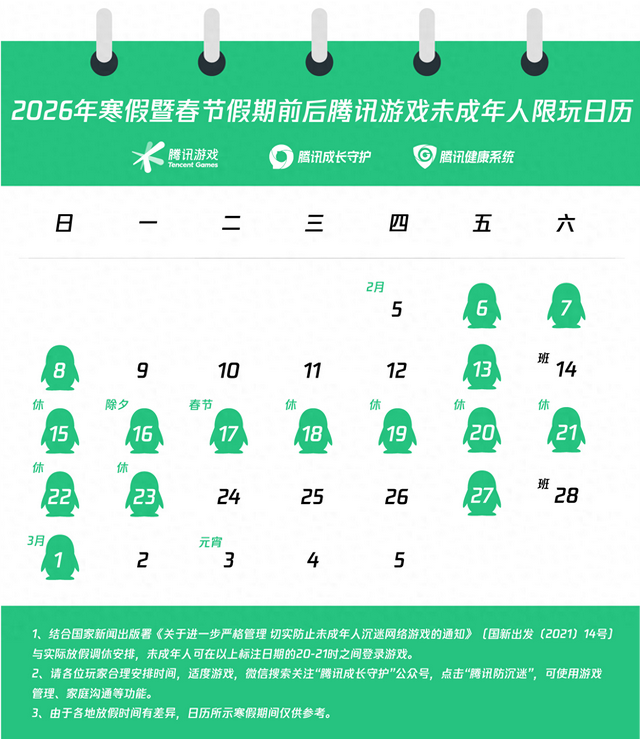 腾讯游戏发布 2026 年寒假限玩日历:未成年玩家最多可玩 15 小时