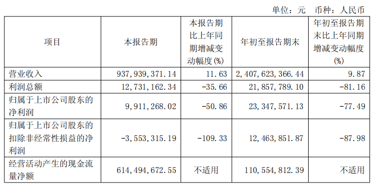 中国经济网北京11月24日讯 富春染织(605189.SH)日前发布2025年三季度报告。2025年前三季度,该 公司实现营业收入24.08亿元,同比增长9.87%;实现归属于上市公司股东的净利润2334.76万元,同比下降 77.49%;实现归属于上市公司股东的扣除非经常性损益的净利润1246.39万元,同比下降87.98%;经营活动 产生的现金流量净额为1.11亿元。 | 人民币 | | --- | | 币种: | | 元 | | 单位: | | 项目 | 本报告期 | 本报告期 比上年同 | | 年初至报告期 末比上年同期 | | --- | --- | --- | --- | --- | | | | | 年初至报告期末 | | | | | 期增减变 | | 增减变动幅度 | | | | 动幅度(%) | | (%) | | 营业收入 | 937.939.371.14 | 11. 63 | 2, 407, 623, 366. 44 | 9.87 | | 利润总额 | 12,731,162.34 | -35. 66 | 21, 857, 789. 10 | -81.16 | | 归属于上市公司股东的 | ...