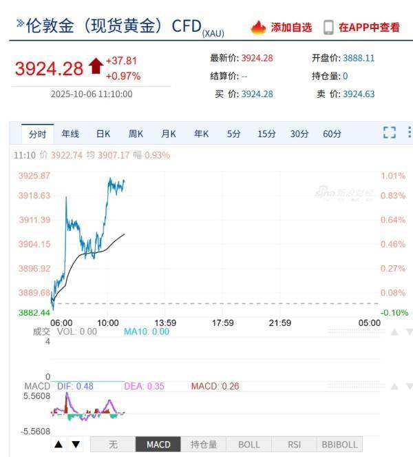 10月6日,黄金价格再创新高。截至发稿时,伦敦黄金市场每盎司黄金价格已经突破3924美元,再涨近 1%。 受黄金价格持续走高影响,作为国内黄金珠宝产业的重要集散地,深圳水贝黄金珠宝市场在假期迎来一 轮婚庆消费热潮。 据央视财经报道,国庆中秋假期,记者在水贝市场看到,黄金市场消费火热,多个商圈客流量络绎不 绝。其中,涉及婚庆产品的店铺生意最是红火。有商户表示:国庆期间,人流量至少翻两倍。我们这里 围得水泄不通,基本上没有停过。 这个假期,水贝市场内的龙凤镯、喜字链、对戒等传统婚庆金饰依旧是销售主流,而随着金价持续攀 升,5D工艺黄金凭借其轻量化、立体感的特色和时尚设计,正成为婚庆市场的新宠,尤其受到年轻消 费者的青睐。 记者在深圳多家品牌门店看到,专柜前都围满了选品的顾客。为新婚筹备"三金""五金"的顾客群体是消 费主力军,其中,婚庆类"一口价"的黄金饰品最为走俏。陈女士告诉记者,作为"刚性支出","一口 价"黄金饰品款式新颖,也符合她的预算。 记者了解到,假期期间,国内部分黄金珠宝品牌的金饰价格延续上涨态势。其中,周生生、周大福、六 福珠宝、老凤祥等品牌的足金首饰价格均突破了1100元/克。多家品牌的"一口价 ...