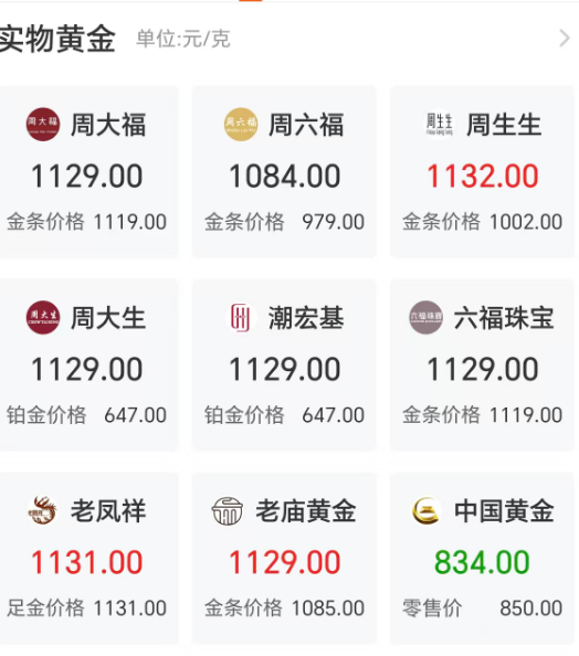10月6日,现货黄金本周开局维持强势,上破3900美元/盎司关口,日内涨幅0.61%,再创历史新高。今年以来累计上涨超48%。距离首次突破3800美元关 口仅不到10天。 "黄金套餐"火了! 与此同时,假期期间,国内部分黄金珠宝品牌的金饰价格延续上涨态势。其中,周生生、周大福、六福珠宝、老凤祥等品牌的足金首饰价格均突破了1100 元/克。 | 国内现货 | 国际现货 | 黄金实物 | | | | --- | --- | --- | --- | --- | | 品牌 | 银行 | 回收 | | | | 品牌 | | | 价格(元/克) | 日涨跌幅 | | 周大福 | | | 1129 | 0.00% | | 老凤祥 | | | 1131 | 0.00% | | 周六福 | | | 1084 | 0.00% | | 周生生 | | | 1132 | 0.00% | | 六福珠宝 | | | 1129 | 0.00% | | 美莹真 | | | 1129 | 0.00% | | 老庙 | | | 1129 | 0.00% | 据央视财经,国庆中秋假期,记者在深圳水贝黄金珠宝市场看到,黄金市场消费火热,多个商圈客流 ...