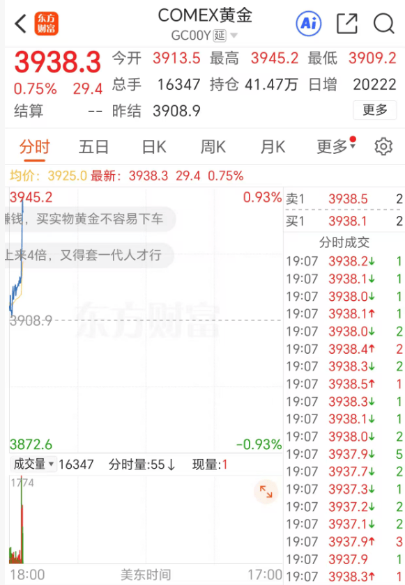本文转自【红网】; 记者了解到,假期期间,国内部分黄金珠宝品牌的金饰价格延续上涨态势。其中,周生生、周大福、六福珠宝、老凤祥等品牌的足金首饰价格均突破了 1100元/克。多家品牌的"一口价"黄金饰品也进行了调价。 新的一周,国际黄金盘中暴涨 再创历史新高 | COMEX黄金 | | | | | | | | --- | --- | --- | --- | --- | --- | --- | | GC00Y 延 ▼ | | | | | | | | 3938.3 今井 3913.5 最高 3945.2 最低 | | | | | 3909.2 | | | 16347 持仓 41.47万 日增 0.75% 29.4 | 总手 | | | | 20222 | | | 提意 昨结 3908.9 | - | | | | 重多 | | | 分时 目K | 五日 | 围K | 目K | | 曲名A | | | 均价:3925.0 最新:3938.3 29.4 0.75% | | | | | | | | 3945.2 | | | 0.93% 卖1 | | 3938.5 | 2 | | 触,买实物黄金不容易下车 | | | | 买1 ...