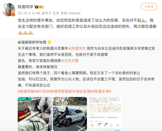 10月5日下午,汽车博主陈震在微博发文就事故再次道歉:"发生这样的意外事故,给您和您的家庭造成 了这么大的伤害,实在对不起,我会全力配合有关部门,做好后续工作以及补偿给您这边造成的损失, 再次跟您道歉。" "北京交警"微博10月4日发布情况通报:10月3日15时许,在海淀区朱各庄路与万寿路交叉口,陈某 (男,43岁)驾驶小客车由北向南行驶时,与对向一辆小客车发生事故,造成两车损坏。双方驾驶人不 涉毒、不涉酒。经初步调查,陈某负事故全部责任。目前,事故正在进一步处理中。 责任编辑:王珂 10月4日下午,陈震在微博发文:"我都看到了,是我的问题,一切负面照单全收,全力配合解决问题 中,不会有丝毫懈怠,事故经过以官方公告、车辆EDR数据为准,造成了这么大的负面影响,在此向对 方车辆道歉,向大家道歉…… " ...