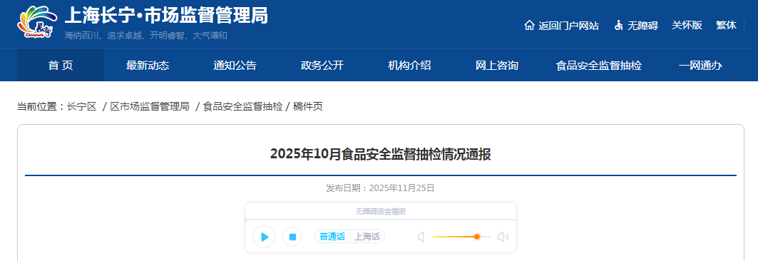 上海市长宁区市场监督管理局2025年10月食品安全监督抽检情况通报