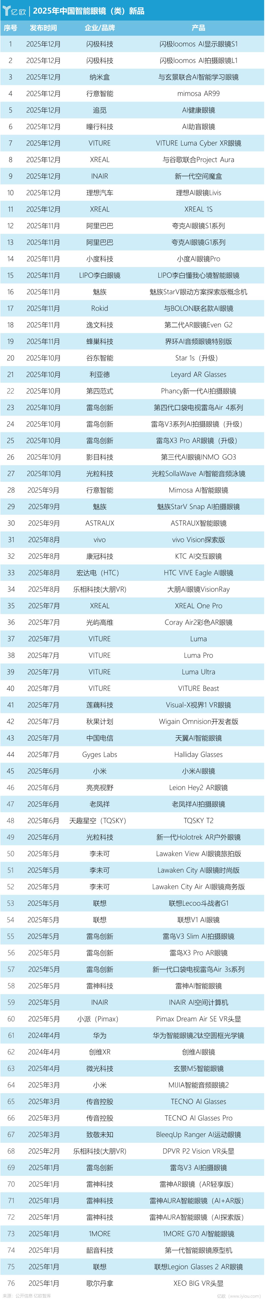 2025年是极不平常的一年,商业层面看,AI大模型攻城略地,智能体落地千行百业验证商业价值,人形机器人已能跑出一场马拉松赛,低空经济乘风而 起,可控核聚变掀起投资热潮……商业世界从来不缺好故事。 聚焦到智能硬件上,2025年AI硬件市场新物种频出,智能可穿戴赛道吸引大量资金涌入。"AI时代,所有硬件都值得用AI重塑一遍",这已是广泛共识。 第五节:行业转向,从拼产品、拼营销转向拼技术、拼创新。 第六节:趋势研判,2026年怎么看? 本文略长,以下为内容提要: 第一节:"百镜大战",76款新品再创新高。 第二节:玩家扩容,176家上市公司入局。 第三节:爆款频出,畅销产品陆续亮相。 第四节:融资提速,近百亿资金涌入。 2025年的智能眼镜行业,热度居高不下。AI时代加速到来,人机交互有了新的可能。想象力驱动之下,众多企业下场肉搏。 本文,亿欧采访十余家智能眼镜头部公司创始人、CEO、高管。这些企业是活跃在"牌桌"上的主流玩家,借助一线创业者们的视角,展现2025年智能眼 镜行业变化。 第一节:"百镜大战",76款新品再创新高 | રા | 2024年4月 | 华为 | 华为智能眼镜2钛空圆框光学镜 | | -- ...
