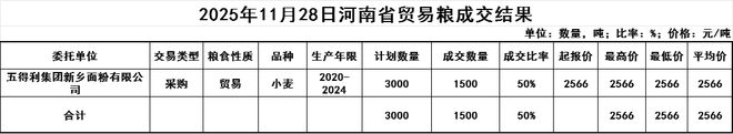 原标题:11月28日河南省贸易小麦成交结果 来源:南方小麦网 | | 2025年11月28日河南省贸易粮成交结果 | | | | | 单位:数量,吨;比率:%;价格:元/吨 | | | | | --- | --- | --- | --- | --- | --- | --- | --- | --- | --- | | 委托单位 | | 交易类型 粮食性质 品种 | 生产年限 | 计划数量 | 成交数量 | 成交比率 起报价 最高价 最低价 平均价 | | | | | 五得利集团新乡面粉有限公 采购 E | | 贸易 小麦 | 2020- 2024 | 3000 | 1500 | 50% 2566 | 2566 | 2566 | 2566 | | 合计 | | | | 3000 | 1500 | 50% | 2566 | 2566 | 2566 | (来源:南方小麦网) 来源:市场资讯 ...