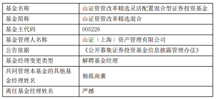 Group 1 - The announcement from Shanxi Securities Asset Management indicates the departure of fund manager Yan Han from the Shanxi Securities Reform Selected Mixed Fund [1] - Yan Han has a background in fixed income research, having worked at Bank of China Fund from July 2014 to September 2020, and joined Shanxi Securities Asset Management in October 2020 [1] - The Shanxi Securities Reform Selected Mixed Fund was established on January 12, 2018, and has reported a year-to-date return of 14.03% and a cumulative return of 23.46% as of November 10, 2025, with a net asset value of 1.2347 yuan [1] Group 2 - The fund is officially named Shanxi Securities Reform Selected Flexible Allocation Mixed Securities Investment Fund, with the main code 005226 [2] - The fund management company is Shanxi (Shanghai) Asset Management Co., Ltd., and the change in fund manager is classified as a dismissal [2] - The fund is co-managed by another fund manager, Du Guo Nan Zhi [2]