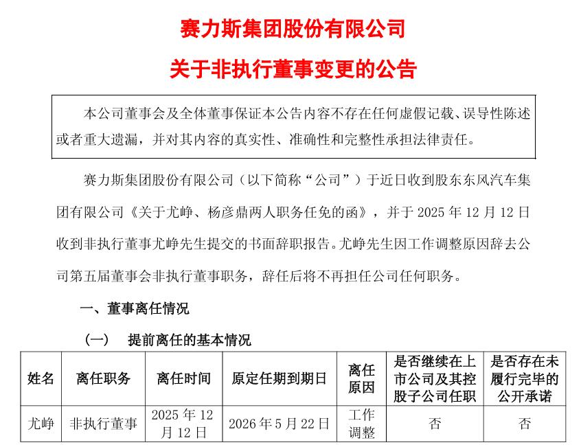| 姓名 | 离任职务 | 离任时间 | 原定任期到期日 | 离任 | 是否继续在上 市公司及其控 履行完毕的 | 是否存在未 | | --- | --- | --- | --- | --- | --- | --- | | | | | | 原因 | | | | | | | | | 股子公司任职 | 公开承诺 | | 尤峥 | 非执行董事 | 2025 年 12 | 2026年5月22日 | 工作 | 合 | 合 | | | | 月 12日 | | 调整 | | | 图片来源:公告截图 12月13日,赛力斯发布公告,非执行董事尤峥因为工作调整原因,辞去公司第五届董事会非执行董事的职务,辞任后不再担任赛力斯任何职务。 值得一提的是,此时正是东风集团全力推进旗下高端新能源品牌岚图汽车发展的关键阶段,况且目前尤峥在东风集团的关键职务是东风汽车集团党委常委、 副总经理,而东风汽车又是赛力斯的股东之一;就在今年9月,尤峥刚刚卸任岚图汽车法定代表人、董事长的职务,由卢放接任公司董事长、总经理兼 CEO,同时多位高管岗位同步完成调整。 而这次尤峥的辞任,或是因为东风汽车内部的工作分工调整,让尤峥没法再兼顾赛力斯的非执行董事工 ...