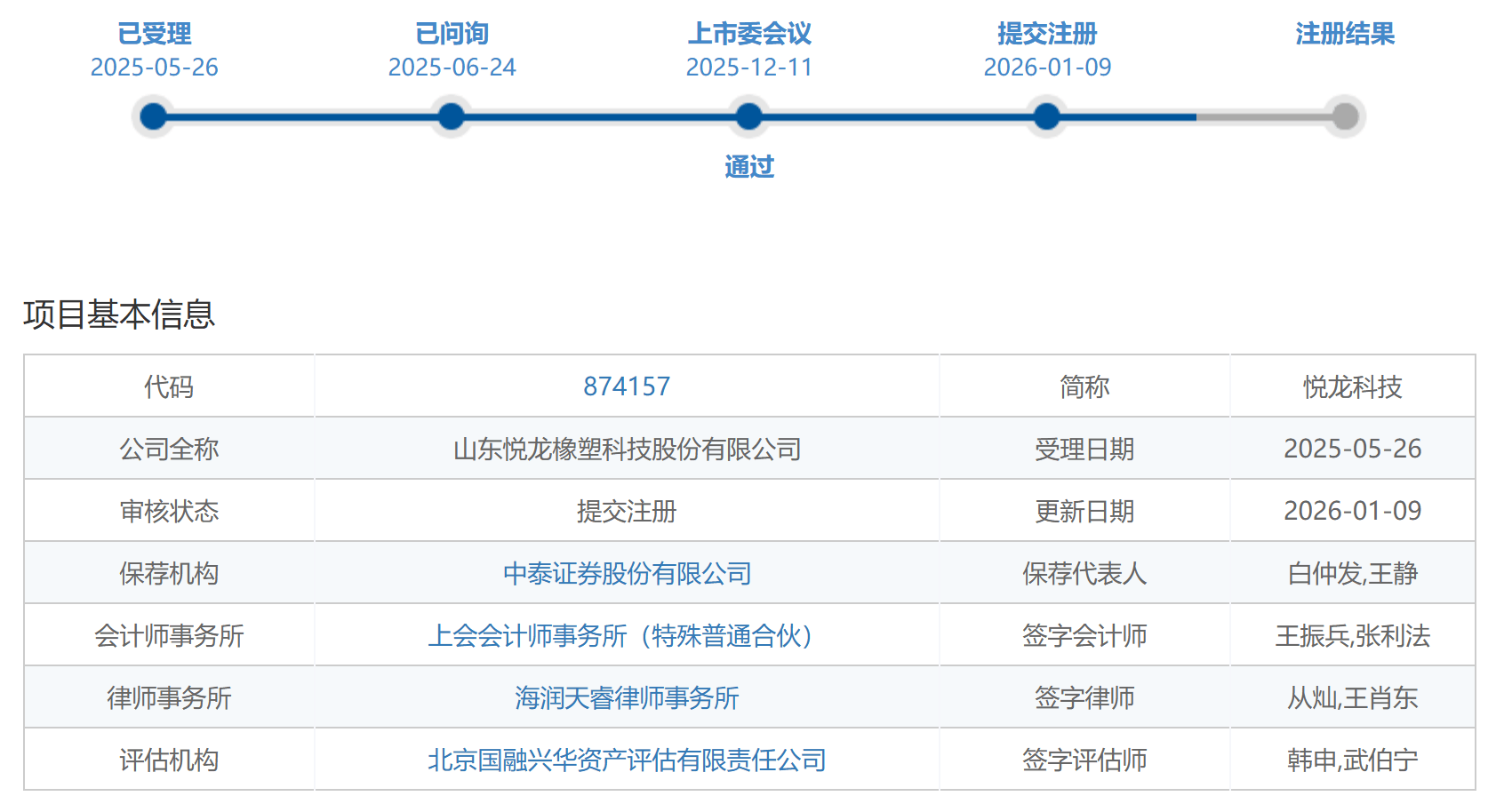 Core Viewpoint - Shandong Yuelong Rubber and Plastic Technology Co., Ltd. (Yuelong Technology) has been approved for its initial public offering (IPO) on the Beijing Stock Exchange, marking it as the 89th company to pass the review this year [1]. Company Overview - Yuelong Technology specializes in the research, production, and sales of flexible pipelines for fluid transportation, including three main series: marine engineering flexible pipelines, land oil and gas flexible pipelines, and industrial special hoses [1]. - The company is sponsored by Zhongtai Securities Co., Ltd., with the lead underwriters being Wang Jing and Bai Zhongfa [1]. Shareholding Structure - As of the signing date of the prospectus, Xu Jincheng directly holds 35,118,777 shares, accounting for 57.57% of Yuelong Technology's total equity. He also indirectly controls an additional 9,895,000 shares through Yantai Baicheng Enterprise Management Center (Limited Partnership), bringing his total control to 73.79% [1]. IPO Details - Yuelong Technology plans to publicly issue up to 21,993,198 shares to unspecified qualified investors, with a potential increase to 25,292,177 shares if the over-allotment option is exercised [2]. - The company aims to raise 289 million yuan (approximately 28.9 million) for several projects, including the construction of a self-floating oil rubber hose production project and upgrades to production facilities [2]. Inquiry Points from Review Meeting - The review meeting raised questions regarding the stability of Yuelong Technology's performance, particularly the impact of falling oil prices on its business and the effects of its acquisition of Techfluid U.K. Ltd. on future performance [3]. - Additionally, the meeting inquired about the company's capacity to absorb new production capacity from the proposed self-floating oil rubber hose production project [3].
