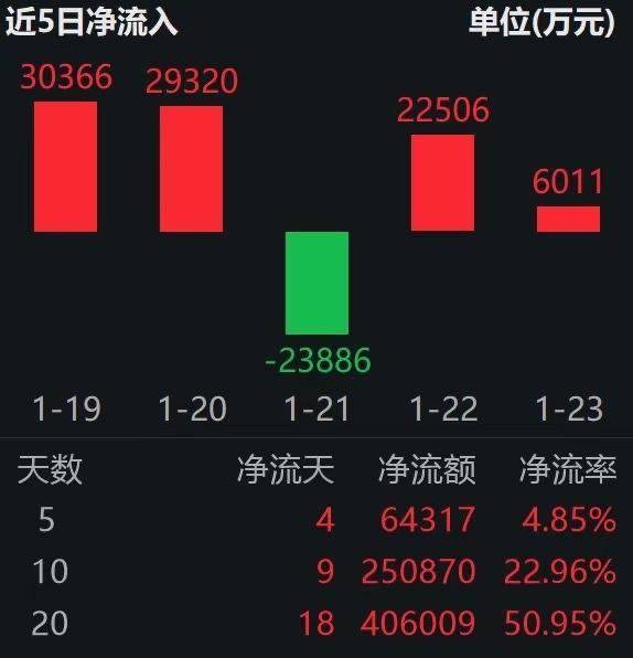 1月29日,国内商品期货开盘多数上涨,沪金涨超7%,沪银涨超4%,燃油涨近3%,氧化铝、沪铝涨超 2%。有色金属板块强势拉升,白银有色8连板,中国黄金5连板,铜陵有色逼近涨停,兴业银锡涨超 8%,云南铜业涨超6%。截至9:35,工业有色ETF万家(560860)开盘大涨4.03%,创历史新高!成交 额达2.9亿,交投活跃。 工业有色ETF万家(560860)备受资金青睐,资金连续5日净流入,合计"吸金"超6.9亿元,近10日"吸 金"超11亿,近20日"吸金"超46亿元。截至1月28日,该基金最新规模攀升至164.78亿元,一举突破160 亿大关! | 近5日净流入 | | | 单位(万元) | | --- | --- | --- | --- | | 22506 | | | 24411 | | | | 15322 | | | | 6011 | | | | | 1391 | | | | 1-22 | 1-23 1-26 | 1-27 | 1-28 | | 天数 | 净流天 | 净流额 | 净流率 | | 5 | 5 | 69642 | 5.04% | | 10 | 0 | 118700 | 9.14% | | ...