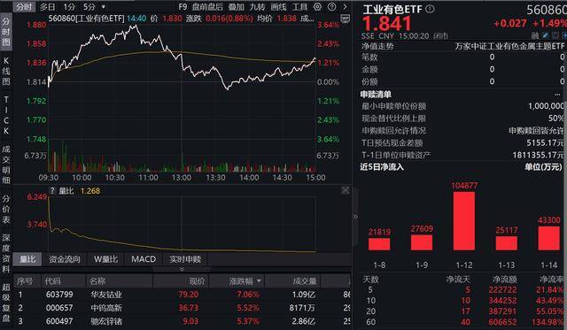 这只产品究竟为何成为资金持续追逐的焦点? 核心原因在于,跟踪高景气的工业有色金属板块,且具备稀缺的独特定位。 当前,工业有色金属板块正站在多重驱动力的交汇点上:宏观政策的有力托底、全球库存的历史低位, 以及新能源革命的澎湃需求,共同构成了行业景气的坚实底座。 工业有色ETF(560860)是当前全市场唯一跟踪中证工业有色金属主题指数的ETF产品,精准聚焦"工业 金属",填补了工业有色金属细分领域的配置空白。 指数前三大金属铜(34.4%)、铝(21.8%)、稀土(13.6%)合计占比约70%,不含金、银、锂,制造 属性纯,聚焦工业金属,锐度高。 近期,铜、铝行情备受关注。聚焦工业金属的工业有色ETF(560860)持续吸引资金流入,截至1月12 日,该基金过去5个交易日资金净流入合计18.8亿元,近10日"吸金"25亿,近60日"吸金"54亿。 资金大量涌入的同时,基金规模迅猛攀升,于1月6日突破百亿,随后于1月12日又迅速突破了120亿元。 资金用真金白银投票,彰显市场信心。 指数前十大成分股汇聚了各工业金属细分领域的绝对龙头,权重集中。包括洛阳钼业(13.09%)、北方稀 土(8.75%)、中国铝业(7. ...
