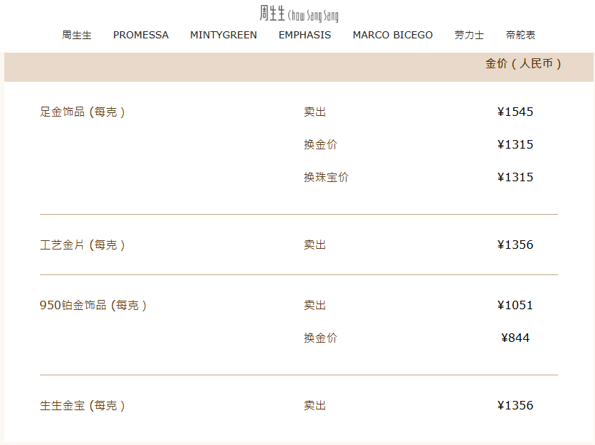 今日,黄金、白银价格继续刷新历史新高, 现货黄金向上触及4960美元/盎司。 与此同时,国内部分品牌金饰克价也有大幅上涨,创历史新高。 老凤祥上海会员中心小程序发布数据显示, 足金饰品报1538元/克,较1月22日上涨超40元/克 。 周生生官网发布数据显示,足金饰品报1545元/克,较1月22日上涨超50元/克 。 | | | 阿士士 (how Sang Sang | | | | --- | --- | --- | --- | --- | | 周生生 PROMESSA | MINTYGREEN | EMPHASIS | MARCO BICEGO | 劳力士 | | | | | | 金价(人民币) | | 足金饰品(每克) | | 卖出 | | ¥1545 | | | | 换金价 | | *1315 | | | | 换珠宝价 | | #1315 | | 工艺金片 (每克 ) | | 卖出 | | #1356 | | 950铂金饰品 (每克 ) | | 卖出 | | *1051 | | | | 换金价 | | ¥844 | | 生生金宝 (每克 ) | | 卖出 | | #1356 | 老庙黄金官网发布数据显示 ...