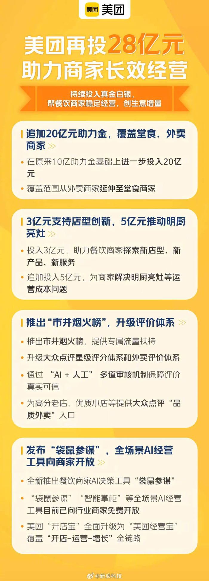 Group 1 - Meituan will add 20 billion yuan in cash support for both takeout and dine-in restaurants to stabilize operations [1] - An additional 3 billion yuan will be invested to encourage restaurants to explore new business models and services [1] - Meituan will provide 5 billion yuan in subsidies for the "Bright Kitchen, Bright Stove" initiative to enhance food safety transparency [1] Group 2 - The "Kangaroo Advisor" AI tool has been launched, providing all-scenario operational tools to merchants for free [8] - The "City Smoke Fire List" has been introduced to upgrade the evaluation system and provide exclusive traffic support [7] - The rating system for public reviews and takeout services has been enhanced with a multi-layer review mechanism to ensure authenticity [7]