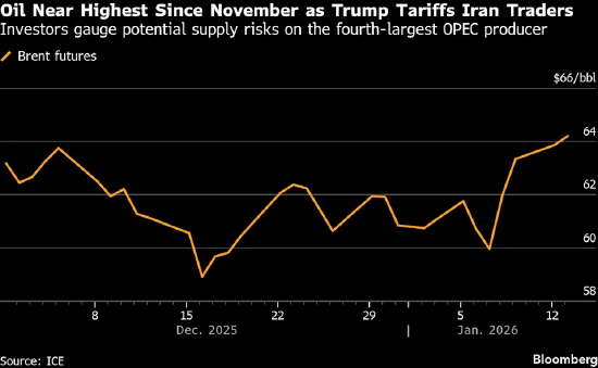 在美国加大对伊朗施压力度,且俄罗斯黑海沿岸一处哈萨克斯坦原油重要外运码头附近油轮遇袭后,国 际油价自去年11月以来首次短暂突破每桶65美元。 布伦特原油期货延续此前三个交易日的上涨势头,累计涨幅超6%。此前,特朗普政府刚以惊人举措掌 控了委内瑞拉石油生产,时隔数日,美国总统唐纳德・特朗普便宣布,对所有"与伊朗有商业往来"的国 家的商品加收25%进口税,同时并未排除对这个波斯湾国家采取军事打击的可能性。 与此同时,原油供应中断的最大诱因,源于负责将哈萨克斯坦原油装载上油轮的里海管道联盟码头。恶 劣天气、无人机袭击以及设备维护等多重因素叠加,正对原油出口构成威胁。周二,两艘船只在该码头 附近遇袭,凸显出原油供应正面临新的风险,目前该码头的原油装载量已被下调近一半,降至每日约90 万桶。 凯雷集团能源路径首席战略官Jeff Currie在接受采访时表示:"当前地缘政治风险处于历史最高水平,这 正是当下油价飙升的导火索。" 油价飙升风险也已显现于期权市场,交易员对看涨合约索要的溢价达到去年以色列和美国空袭伊朗以来 的最高水平。周一,布伦特原油看涨期权成交量创下历史纪录,这在一定程度上是由押注油价上涨的大 额交易推动的 ...