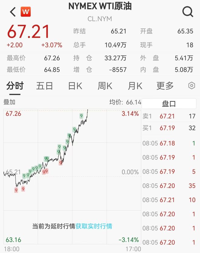 记者丨吴斌 刘雪莹 | W | | NYMEX WTI原油 | | | | | | --- | --- | --- | --- | --- | --- | --- | | | CL.NYM | | | | | | | | 昨结 65.21 | | 开盘 | | | 65.35 | | +2.00 | +3.07% 总手 10.49万 | | | 现手 | | 18 | | 最高价 | 67.26 持 仓 33.27万 | | | 外 盘 | | 5.41万 | | 最低价 | 64.85 增 仓 -8557 | | | 内 盘 | | 5.08万 | | 分时 | 五日 日K | | 周K 月K | | 重名 | (0) | | 暨加 | | | 均价:66.14 | | 盘口 | | | 67.26 | | | 3.14% | 卖1 | 67.21 | 17 | | | | | | 元1 | 67.19 | 32 | | | | | | 08:05 67.18 | | 1 | | | | | | 08:05 67.19 | | 1 | | | | | | 08:05 67.19 | | 5 | | | | ...