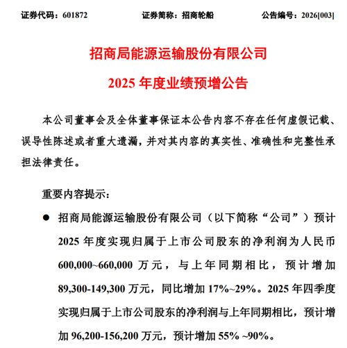 1月8日晚间,招商局能源运输股份有限公司发布2025年度业绩预增公告。 根据公告,招商轮船预计2025年度实现归属于上市公司股东的净利润为人民币60亿元至66亿元,与上年同期相比预 计增加8.93亿元至14.93亿元,增幅17%-29%。2025 年四季度实现归属于上市公司股东的净利润与上年同期相比,预 计增加9.62亿元至15.62亿元,增幅55%-90%。 预计招商轮船2025年度实现归属于上市公司股东的扣除非经常性损益的净利润为50.05亿元至56.05亿元,与上年同 期相比,预计增加-1000万元至5.9亿元,同比增加-0.2%-12%。2025年四季度实现归属于上市公司股东的扣除非经常 性损益的净利润与上年同期相比,预计增加3.77亿元至9.77亿元,增幅22%-57%。 回顾2024年,招商轮船利润总额59.52亿元,实现归属于上市公司股东的净利润51.07亿元,归属于上市公司股东的 扣除非经常性损益的净利润50.15亿元,每股收益为0.63元。 招商轮船表示,2025年度业绩预计出现增长的主要原因包括:油船船队抓住市场复苏机遇,第四季度经营利润同比 预计增加200-230%;受益于多种因素,报告 ...