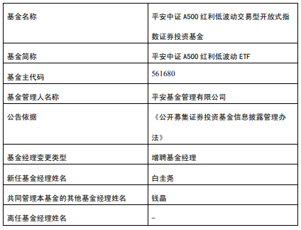 中国经济网北京11月6日讯今日,平安基金公告,平安中证A500红利低波动ETF增聘白圭尧。 | 基金名称 | 平安中证 A500 红利低波动交易型开放式指 | | --- | --- | | | 数证券投资基金 | | 基金简称 | 平安中证 A500 红利低波动 ETF | | 基金主代码 | 561680 | | 基金管理人名称 | 平安基金管理有限公司 | | 公告依据 | 《公开募集证券投资基金信息披露管理办 | | | 法》 | | 基金经理变更类型 | 增聘基金经理 | | 新任基金经理姓名 | 白圭尧 | | 共同管理本基金的其他基金经理姓名 | 钱晶 | | 离任基金经理姓名 | - | 平安中证A500红利低波动ETF成立于2025年8月27日,截至2025年11月5日,成立来收益率为2.30%。 白圭尧曾任中国五矿集团公司交易员、中国邮政储蓄银行资产管理部投资经理、中邮理财有限责任公司 组合策略部高级副总裁,2025年5月加入平安基金管理有限公司。 ...