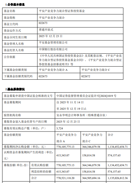 | 基金名称 | 平安产业竞争力混合型证券投资基金 | | --- | --- | | 基金简称 | 平安产业竞争力混合 | | 基金主代码 | 022673 | | 基金运作方式 | 普通开放式 | | 基金合同生效日期 | 2025年12月23日 | | 基金管理人名称 | 平安基金管理有限公司 | | 基金托管人名称 | 中国银行股份有限公司 | | 公告依据 | 《中华人民共和国证券投资基金法》及其配套法规、《平安产业竞 争力混合型证券投资基金基金合同》、《平安产业竞争力混合型证 | | | 舜投资基金招募说明书》尊 | | 下属基金份额类别 | 平安产业竞争力混合 A 平安产业竞争力混合 C | | 下属基金份额类别代码 | 022673 022672 | 中国经济网北京12月25日讯 今日,平安基金管理有限公司发布关于平安产业竞争力混合型证券投 资基金基金合同生效公告。 募集期间净认购金额1,134,452,654.71元,认购资金在募集期间产生的利息574,157.65元,募集份额 合计1,135,026,812.36份。 该基金拟任基金经理林清源2011年7月加入融通基金管理有限公司,历任互联 ...