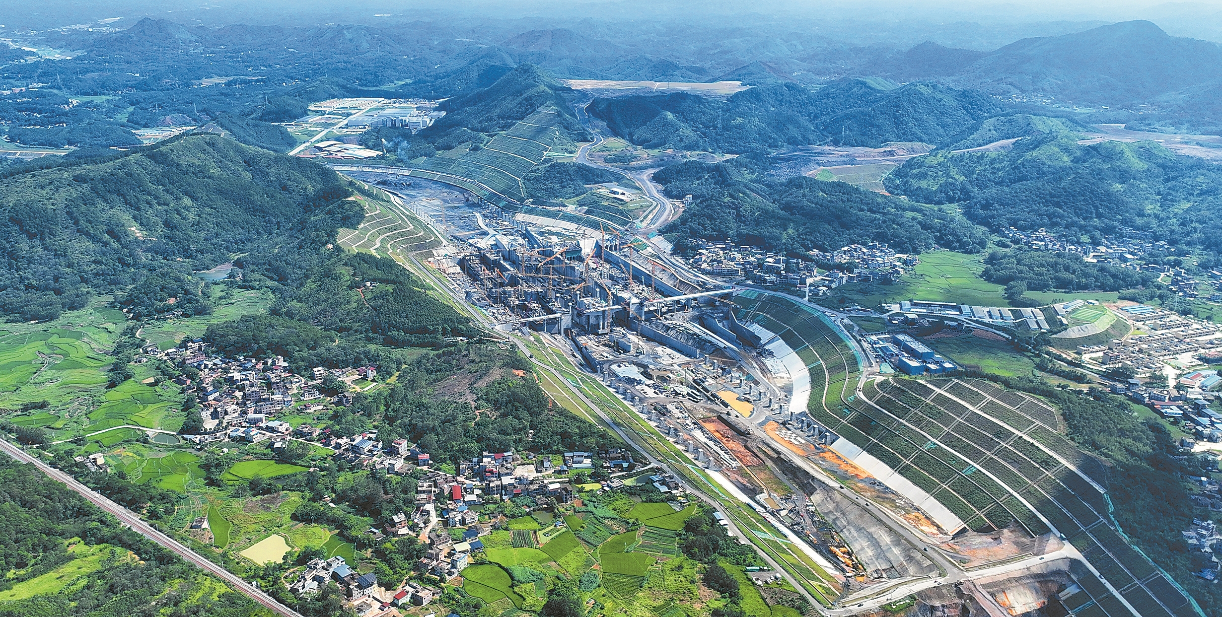 建设中的马道枢纽。 一河贯通,八桂向海。 站在钦州市钦南区平山岛边坡远眺,百米宽的平陆运河,疏浚船舶轰鸣作业,护岸施工人员往来穿梭,房建工程塔吊铁臂飞舞——昔日绘于纸上的通江 达海蓝图,正以日新月异的速度,一步步变成触手可及的实景。 "平陆运河航道14标全长9.01公里,大部分区段已经通水,未来可满足5000吨级货轮通航需求。"指着眼前渐趋成型的航道,平陆运河航道14标项目经理 蒋红晖告诉记者,目前标段土石方开挖累计完成92.9%,产值累计完成83.1%,整体进度已超预期,"我们正集中力量啃'硬骨头',攻克剩余建设节点,用钉 钉子精神确保按期完工。" 随着各航道标段接连突破关键节点,这条世界级运河,正以震撼人心的"中国速度"在八桂大地穿山破岭,"一江春水向南流"的通航格局不断延伸。 一组亮眼的数据,记录着这场建设奇迹:截至10月9日,项目累计完成投资超608亿元,土石方开挖和枢纽船闸主体混凝土浇筑完成量分别超92%、 95%,航道基本成型段的施工长度完成率超84%,已连续3年超额完成建设计划。 桥梁建设同样捷报频传:旧州大桥全桥合龙、陆杨新村大桥格子梁合龙、新福镇过江通道桥完成管内混凝土灌注——一个个项目节点 ...