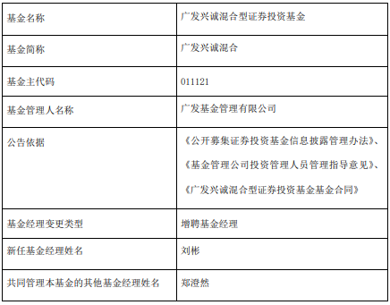 | 基金名称 | 广发兴诚混合型证券投资基金 | | --- | --- | | 基金简称 | 广发兴诚混合 | | 基金主代码 | 011121 | | 基金管理人名称 | 广发基金管理有限公司 | | 公告依据 | 《公开募集证券投资基金信息技露管理办法》、 | | | 《基金管理公司投资管理人员管理指导意见》、 | | | 《广发兴诚混合型证券投资基金基金合同》 | | 基金经理变更类型 | 增聘基金经理 | | 新任基金经理姓名 | 刘彬 | | 共同管理本基金的其他基金经理姓名 | 郑澄然 | 中国经济网北京10月9日讯 近日,广发基金公告,广发兴诚混合增聘刘彬。 刘彬2011年7月1日至2015年3月27日任中信建投证券股份有限公司研究发展部分析师,2015年4月3 日至2022年10月31日在新华基金管理有限公司先后任研究部研究员、研究部基金经理助理、权益投资部 基金经理、权益投资部副总监。2022年11月3日加入广发基金管理有限公司,现任成长投资部基金经 理。 广发兴诚混合A/C成立于2021年1月6日,截至2025年9月30日,其今年来收益率为19.89%、 19.54%,成立来收益率为-4 ...