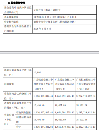 中国经济网北京1月9日讯 今日,广发基金发布广发悦盈稳健三个月持有期混合型发起式基金中基金 (FOF)基金合同生效公告。 该基金拟任基金经理曹建文2013年4月至2015年5月任浦银安盛基金管理有限公司金融工程部金融分析 师,自2015年6月至2016年8月任浦银安盛基金管理有限公司金融工程部投资经理,自2016年9月至2021 年9月任平安养老保险股份有限公司量化投资团队投资经理。2021年9月3日加入广发基金管理有限公 司。 | 2. 基金高条情况 | | | --- | --- | | 基金募集申请获中国证监 | 证监许可(2025) 2480号 | | 会核准的文号 | | | 基金尊集期间 | 自2026年1月5日至2026年1月6日止 | | 验资机构名称 | 捷勤华永会计师事务所(特殊普通合伙) | | 募集资金划入基金托管专 | 2026年1月8日 | | 户的日期 | | | 募集有效认购总户數(单 | | 10,892 | | | | --- | --- | --- | --- | --- | | 位:户) | | | | | | 份额级别 | | 广发悦盈稳健三个 | 广发快盈稳健三个 ...