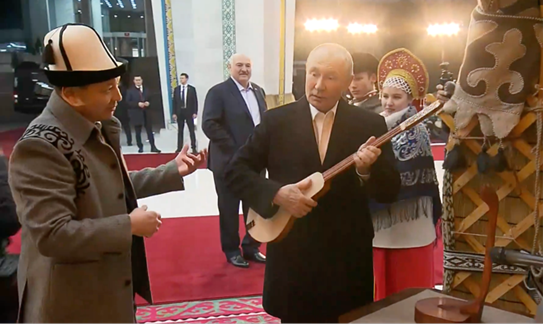 普京访吉尔吉斯斯坦期间试弹传统乐器库姆孜,卢卡申科在身后聆听
