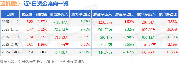 股票行情快报:蓝帆医疗(002382)11月12日主力资金净卖出410.47万元