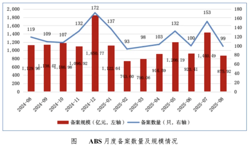 Group 1 - In August 2025, a total of 99 new asset-backed special plans (ABS) were registered, with a combined scale of 875.92 billion yuan [1] - The top three ABS underlying assets by registration scale were accounts receivable (250.89 billion yuan), micro-loan receivables (213.01 billion yuan), and financing lease receivables (189.73 billion yuan) [1] Group 2 - As of the end of August 2025, there were 2,573 active ABS with a total scale of 21,891.65 billion yuan [2] - Among these, 80 ABS related to infrastructure public REITs had a total scale of 1,968.53 billion yuan [2] - The total scale of ABS with underlying assets such as accounts receivable, real estate holding ABS, CMBS, financing lease receivables, and micro-loan receivables accounted for 79.02% of the total active scale, amounting to 17,299.04 billion yuan [4]
