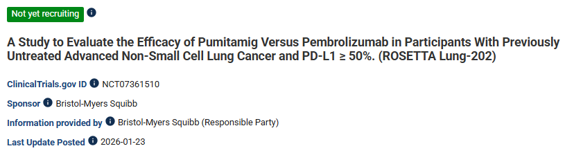 1月23日,美国临床试验收录网站显示,百时美施贵宝(BMS)就PD-L1/VEGF-A双抗Pumitamig启动了两项新的III期临床试验(ROSETTA Lung-201和 ROSETTA Lung-202)。 Pumitamig最初由普米斯生物发现,该公司在2023年11月将该药物在中国以外的全球开发、生产与商业化权益授予BioNTech。一年后,普米斯生物被 BioNTech以9.5亿美元的总金额并购。2025年6月,BMS豪掷111亿美元从BioNTech手中获得Pumitamig的全球合作开发与商业化权益。 ROSETTA Lung-201拟纳入850例在接受基于铂类化疗的同步放化疗方案治疗后未出现疾病进展的不可切除的III期非小细胞肺癌(NSCLC)患者,旨在评 估Pumitamig对比度伐利尤单抗作为后续治疗方案的疗效和安全性。研究的主要终点是无进展生存期(PFS)。 ROSETTA Lung-202拟纳入750例既往未接受过治疗且PD-L1表达≥50%的晚期NSCLC患者,旨在评估Pumitamig对比帕博利珠单抗作为一线治疗的疗效和安 全性。研究的主要终点是PFS和总生存期(OS)。 | 双 ...