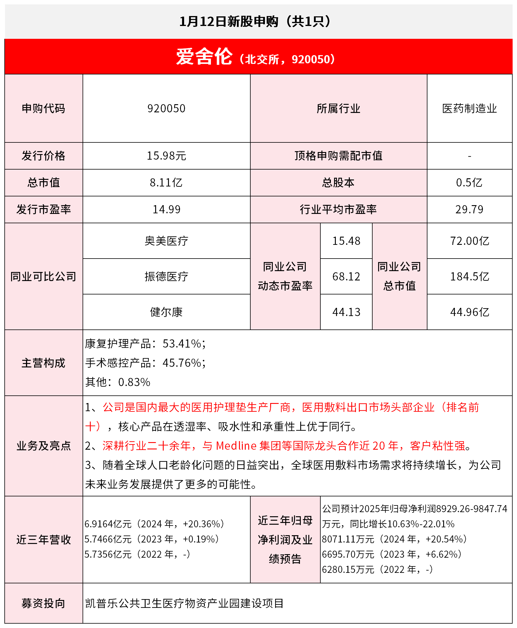 | | 3、限有王以人口を欧化門越的目位デロ,王琳尼 | | --- | --- | | | 未来业务发展提供了更多的可能性。 | | | 近三年归母 6.9164亿元(2024年,+20.36%) | | 近三年营收 | 5.7466亿元 (2023年,+0.19%) 净利润及业 | | | 5.7356亿元(2022年,-) 绩预告 | | 募资投向 | 凯普乐公共卫生医疗物资产业园建设项目 | *免责声明:文章内容仅供参考,不构成投资建议 *风险提示:股市有风险,入市需谨慎 1月12日新股申购 (共15 | 爱舍伦(北交所, 92005 | | --- | | 申购代码 | 920050 | | --- | --- | | 发行价格 | 15.98元 顶格F | | 总市值 | 8.11亿 | | 发行市盈率 | 14.99 行业 | | 同业可比公司 | 奥美医疗 同业公司 | | | 振德医疗 动态市盈率 | | | 健尔康 | | 主营构成 | 康复护理产品: 53.41%; 手术感控产品:45.76%; | | | 其他:0.83% | | | 1、公司是国内最大的医用护理垫生产厂商,医用 | ...