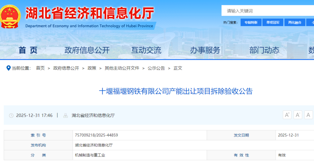 | C 2025-12-31 17:46 | 品 湖北省经济和信息化厅 | | AAA | | --- | --- | --- | --- | | 索 引 号 | 757009218/2025-44859 | 发文日期 | 2025-12-31 | | 发布机构 | 湖北省经济和信息化厅 | | | | मे 米 | 机械制造与重工业 | 有 效 性 | 有效 | 湖北省经济和信息化厅 2025年12月31日 2023年2月7日省经信厅发布的《十堰福堰钢铁有限公司产能出让方案公告》(〔2023〕年第1号),出让的60万吨炼钢产能指标所属冶炼设备(70吨电炉1 台)已按《钢铁行业产能置换实施办法》要求完成拆除,通过省级验收。 特此公告。 | | 出让产能企业情况 | | | | | | | | --- | --- | --- | --- | --- | --- | --- | --- | | 市、县 | 冶炼设备情况 企业名称 | 梅斯 | | | | | 备注 | | | 理号(容里) 単位 | | 类别(电炉) | | 设备教里(台) | 出让产能 (万吨) | 出让项目治炼设备及产能指标 在 2016年省 ...