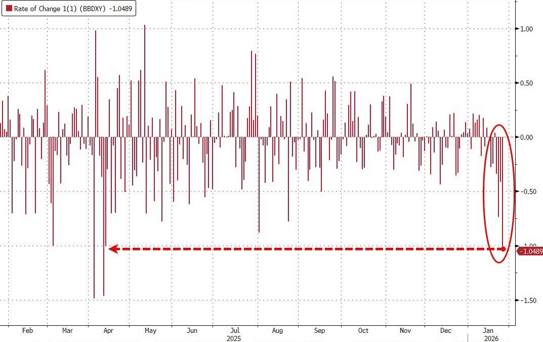 美元正遭遇近四年来最严重的抛售潮,交易员押注美元将进一步走弱。彭博美元即期指数出现自去年4月宣布全面关税以来最陡峭的四日跌幅,投资者为 对冲更深度抛售支付的成本已创历史新高。 美元的下跌推动其他主要货币飙升至多年高位。欧元和英镑均升至约四年半以来的最强水平,日元在日本官员暗示可能干预支持本币后大幅反弹,正迎 来自去年8月全球套利交易崩盘以来的最佳三日涨势。 这轮跌势由多重因素驱动。美国政策的不可预测性——包括特朗普威胁接管格陵兰岛令欧洲盟友震惊,特朗普对美联储施压的风险,美国财政前景和债 务负担的担忧,以及政治极化,都在侵蚀市场情绪。摩根士丹利新兴市场货币策略主管James Lord表示,"非常规催化剂正在推动美元走弱",政策不确 定性正在打击投资者对美国资产的兴趣。 日元干预预期升温 日元的飙升成为美元承压的关键因素。据交易员上周五透露,纽约联储联系金融机构查询日元汇率——这一初步步骤通常在干预前采取,重新引发市场 对协调货币干预的猜测。 DWS Americas固定收益主管George Catrambone表示,美联储官员对美元兑日元汇率的查询"进一步压低了美元"。日元涨至152.43。 彭博美元指数周二 ...