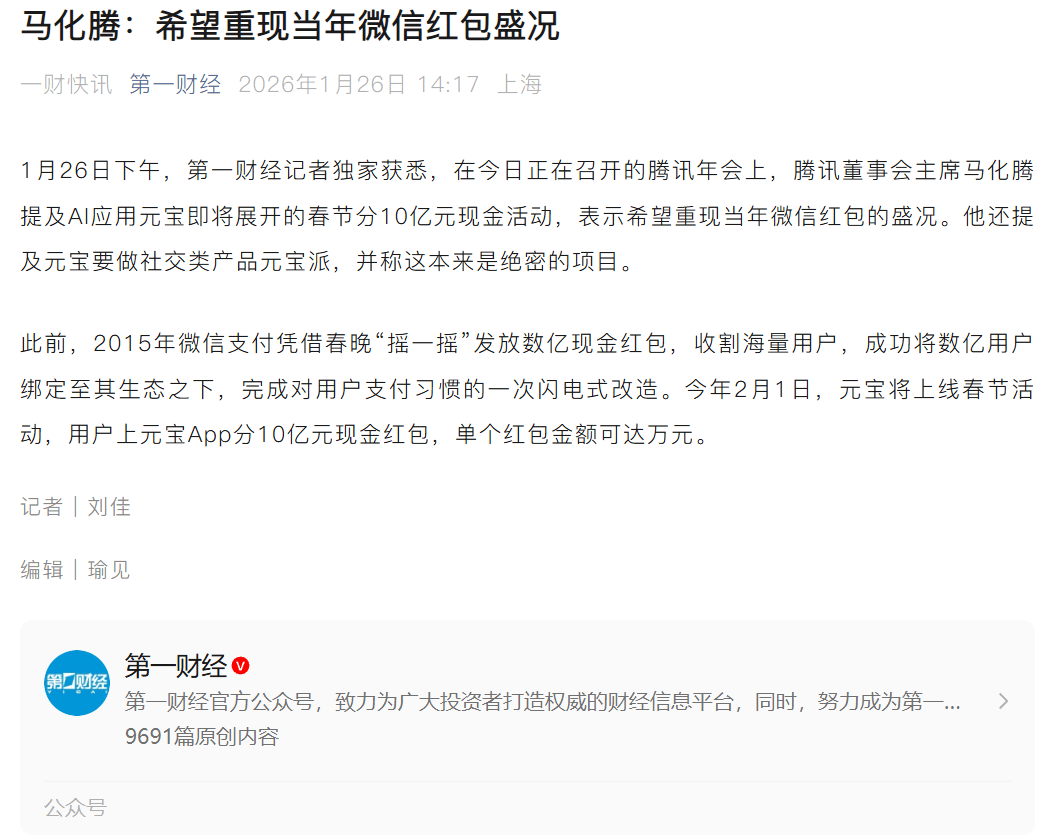 1月26日下午,"第一财经"报道,在今日正在召开的腾讯年会上,腾讯董事会主席马化腾提及AI应用元宝即将展开的春节分10亿元现金活动,表示希 望重现当年微信红包的盛况。据悉,今年2月1日,元宝将上线春节活动,用户上元宝App分10亿元现金红包,单个红包金额可达万元。 图源:公众号截图 编辑 此外,马化腾还提及元宝要做社交类产品元宝派,并称这本来是绝密的项目。 互联网时代的爆发,2015年是一个重要节点。当年腾讯通过央视春晚的"摇一摇"红包活动,以5亿元现金红包发放,成功绑定2亿张银行卡,不仅提 升了微信支付的用户量,也开创了互联网平台通过大规模发钱进行用户增长和品牌推广的先河。此后,各大互联网平台纷纷效仿,如阿里巴巴、百 度、抖音等在春节等节点推出红包活动,发钱营销成为互联网行业获取用户、提升活跃度的重要手段。 2021年"撒钱营销"更是达到巅峰,各平台春节发放红包总额超过180亿元,抖音、快手、百度、支付宝等大厂纷纷拿出巨额资金,以集福、抢红包、 组队瓜分等各种玩法吸引用户。 此后,各大厂"撒钱营销"的规模开始逐渐缩小,在2023年和2024年,各家互联网大厂发出的红包总额还在50亿元上下,到了2025年春节 ...