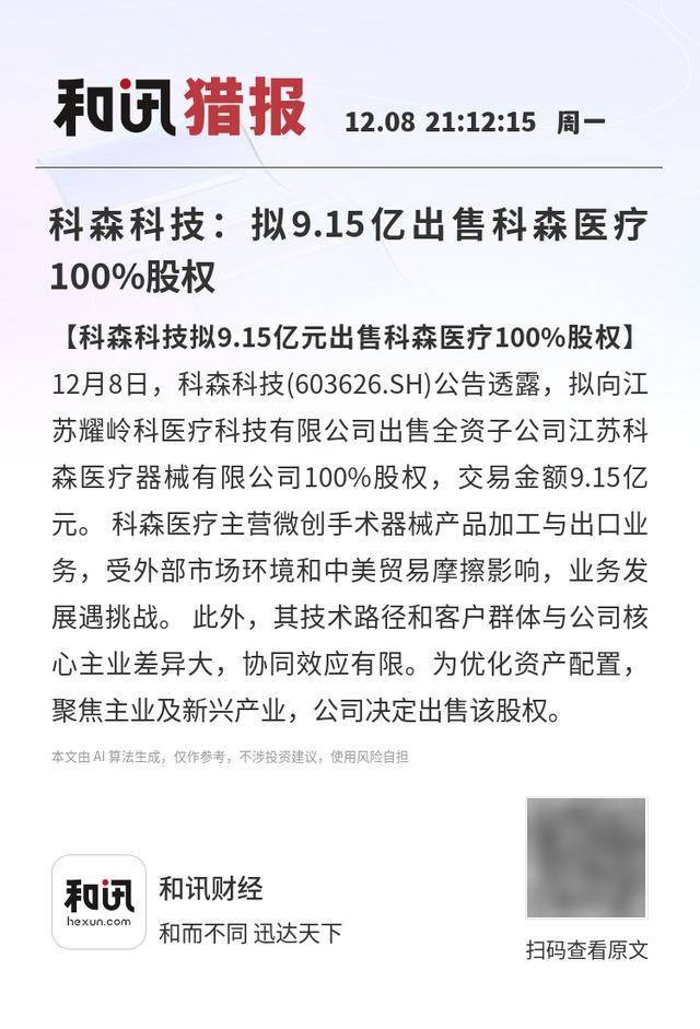 【科森科技拟9.15亿元出售科森医疗100%股权】12月8日,科森科技(603626.SH)公告透露,拟向江苏耀 岭科医疗科技有限公司出售全资子公司江苏科森医疗器械有限公司100%股权,交易金额9.15亿元。科 森医疗主营微创手术器械产品加工与出口业务,受外部市场环境和中美贸易摩擦影响,业务发展遇挑 战。此外,其技术路径和客户群体与公司核心主业差异大,协同效应有限。为优化资产配置,聚焦主业 及新兴产业,公司决定出售该股权。 本文由 AI 算法生成,仅作参考,不涉投资建议,使用风险自担 和讯猎报 12.08 21:12:15 周- 科森科技:拟9.15亿出售科森医疗 100%股权 扫码查看原文 【科森科技拟9.15亿元出售科森医疗100%股权】 12月8日,科森科技(603626.SH)公告透露,拟向江 苏耀岭科医疗科技有限公司出售全资子公司江苏科 森医疗器械有限公司100%股权,交易金额9.15亿 元。科森医疗主营微创手术器械产品加工与出口业 务,受外部市场环境和中美贸易摩擦影响,业务发 展遇挑战。此外,其技术路径和客户群体与公司核 心主业差异大,协同效应有限。为优化资产配置, 聚焦主业及新兴产业,公司决定出 ...