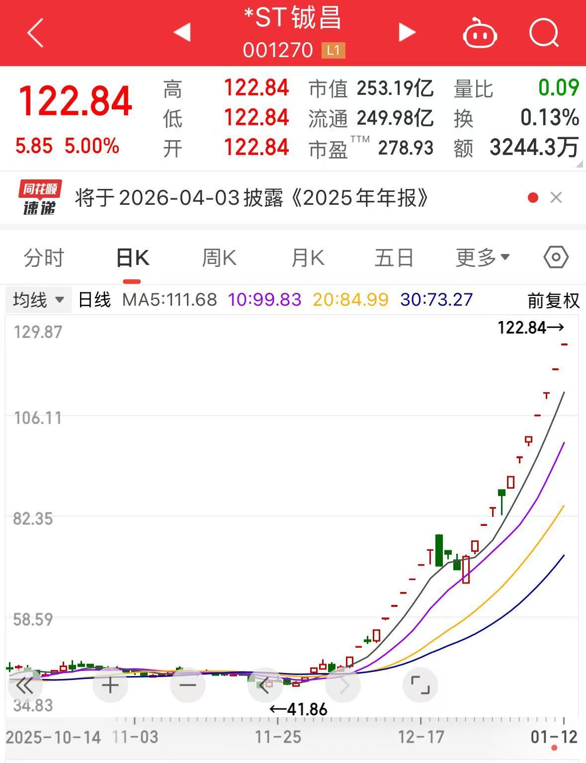 1月12日晚,*ST铖昌公告称,公司股票交易连续10个交易日内4次出现同向股票交易异常波动情形,属于股票交易严重异常波动的情况。为维护投资者利 益,公司申请股票自2026年1月13日开市起停牌,待核查结束并披露相关公告后复牌,预计停牌时间不超过3个交易日。 同日,*ST铖昌还发布股票严重异常波动公告称,商业航天行业处于产业初期阶段,公司基本面未发生重大变化。 每经编辑|黄胜 封面图片来源:每日经济新闻 值得一提的是,*ST铖昌股价自去年12月1日以来出现大幅拉升,至今累计涨幅达177%,近11个交易日收获10个涨停板。 截至今日,该股报收122.84元/股,总市值为253.2亿元。 | | | | *ST 钱昌 | | | | --- | --- | --- | --- | --- | --- | | | | | 001270 LT | | | | 122.84 | 高 | 122.84 市值 253.19亿 量比 | | | | | | ਜ਼ਿੰ | 122.84 流通 249.98亿 换 | | | 0.1 | | 5.85 5.00% | 井 | 122.84 市盈 278.93 | | 额 3244. ...