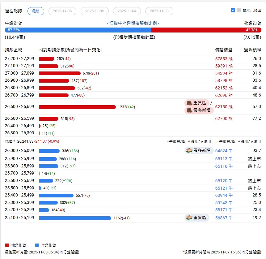Group 1 - The latest bull-bear ratio for the Hang Seng Index is 57:43 as of November 8 [1] - The heavy zone for bear certificates is in the range of 26,600 to 26,699, with a total of 1,232 bear certificates, an increase of 42 from the previous trading day [1] - The heavy zone for bull certificates is in the range of 25,100 to 25,199, with a total of 1,162 bull certificates, a decrease of 41 from the previous trading day [1] Group 2 - The most significant increase in bull certificates occurred in the range of 26,000 to 26,099, with a total of 336 bull certificates, an increase of 186 from the previous trading day [1] - The bear certificates in the range of 26,600 to 26,699 are the most concentrated, indicating a potential bearish sentiment in that price range [2] - The overall market sentiment shows a slight decline, with the current price of the Hang Seng Index at 26,241.83, down 244.07 points or 0.9% [2]
