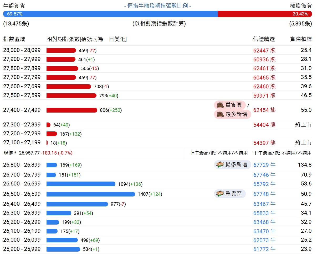 | 牛證街貨 | | - 恒指牛熊證期指張數比例- | | | 熊證街貨 | | --- | --- | --- | --- | --- | --- | | 63.86% | | | | | 36.14% | | (11,761張) | | (以相對期指張數計算) | | | (6,6555長) | | 指數區域 | 相對期指張數[括號內為一日變化] | | | 信證精選 | 雷際槓桿 | | 27,400 - 27,499 | 486(-84) | | | 62454 龍 | 25.6 | | 27,300 - 27,399 | 437(-67) | | | 60464 # | 28.6 | | 27,200 - 27,299 | | 1034(-182) | 重量 | 62451 能 | 31.0 | | 27.100 - 27.199 | | 873(-112) | | 59967 能 | 36.1 | | 27,000 - 27,099 | 263(-60) | | | 60584 能 | 36.6 | | 26,900 - 26,999 | 155(+7) | | | 61020 龍 | 将上市 | ...