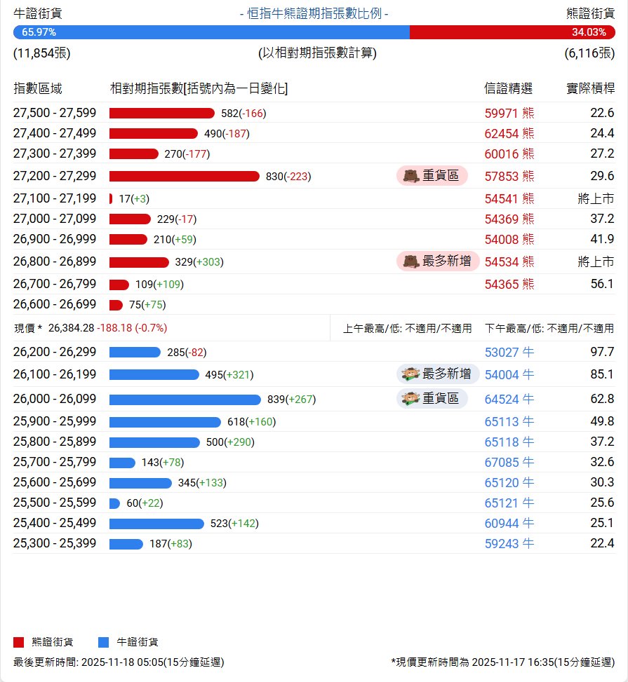 Core Insights - As of November 18, the Hang Seng Index (HSI) has a bull-bear ratio of 66:34, indicating a predominance of bullish sentiment among investors [1][2] Bullish and Bearish Certificates - The distribution of bear certificates shows a significant concentration in the 27,200-27,299 range, with 830 certificates, a decrease of 223 from the previous trading day [1] - The most notable increase in bear certificates occurred in the 26,800-26,899 range, which saw an addition of 303 certificates, bringing the total to 329 [1][2] - In contrast, the bullish certificates are heavily concentrated in the 26,000-26,099 range, with 839 certificates, an increase of 267 from the previous day [1] - The 26,100-26,199 range experienced the largest increase in bullish certificates, adding 321 to reach a total of 495 [1][2] Market Performance - The current price of the Hang Seng Index is 26,384.28, reflecting a decrease of 188.18 points or 0.7% [2] - The highest and lowest prices for the afternoon session are not applicable, indicating a lack of significant volatility during that period [2]