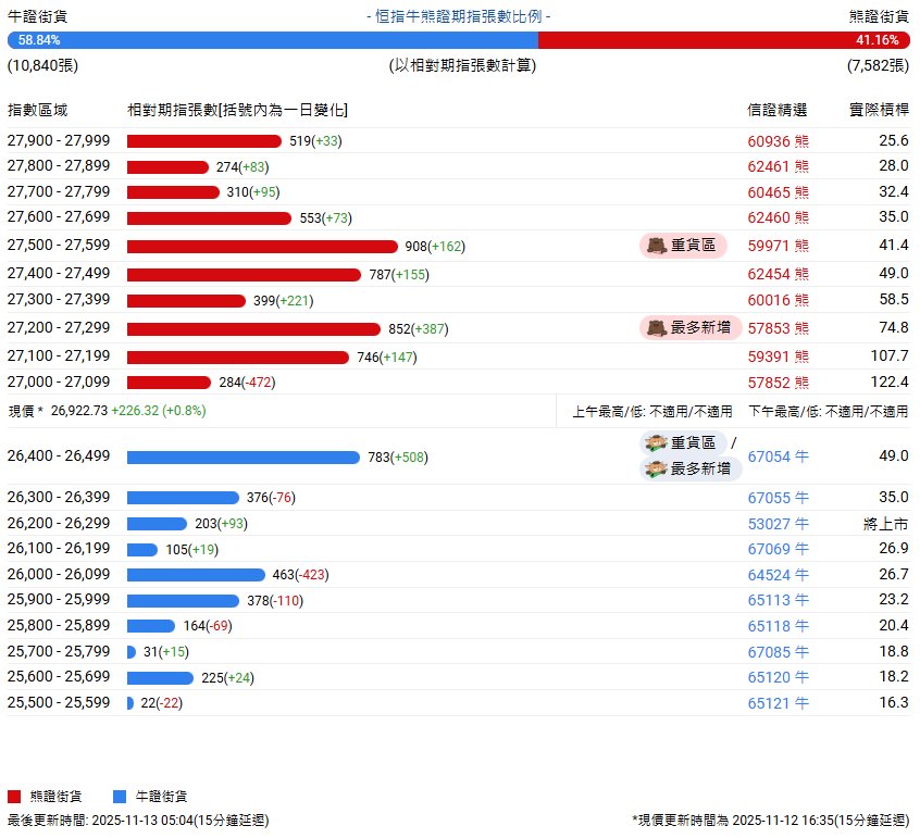 | 牛證街貨 | | - 恒指牛熊證期指張數比例- | | | 熊證街貨 | | --- | --- | --- | --- | --- | --- | | 70.58% | | | | | 29.42% | | (13,578張) | | (以相對期指張數計算) | | | (5,660張) | | 指數區域 | 相對期指張數[括號內為一日變化] | | | 信證精選 | 實際槓桿 | | 27,200 - 27,299 | 412(-30) | | | 57853 BE | 18.3 | | 27,100 - 27,199 | 24(+8) | | | 54541 BE | 19.1 | | 27,000 - 27,099 | 178(+22) | | | 54369 NE | 21.2 | | 26,900 - 26,999 | 139(+13) | | | 55110 RE | 23.1 | | 26,800 - 26,899 | 240(+37) | | | 54534 BE | 24.6 | | 26,700 - 26,799 | 263(-12) | | | 54865 NE | 27.2 | ...