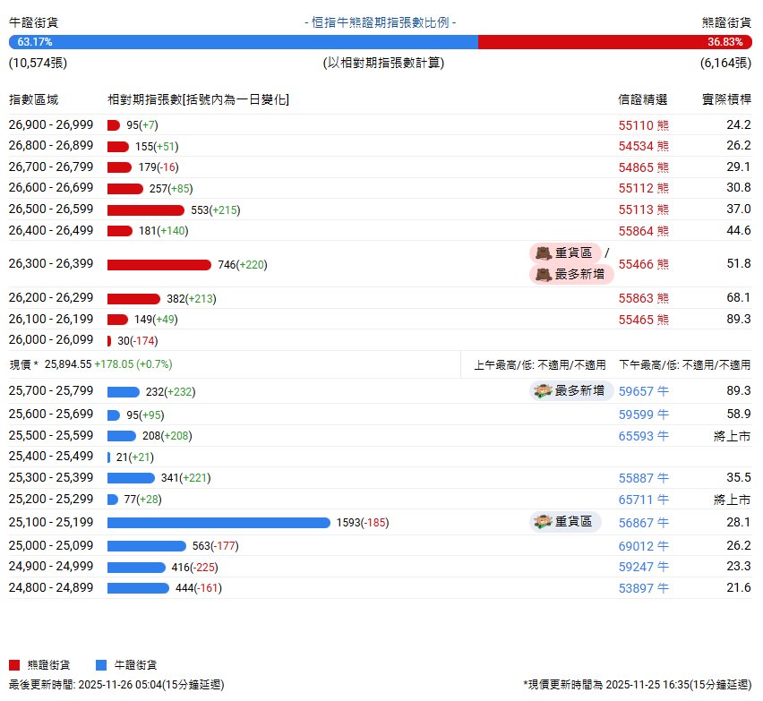 智通财经APP获悉,截至11月26日,恒指最新的牛熊街货比例为63:37。 中信证券牛熊证街货分布图中的数据显示,熊证街货重货区和最多新增都在26300-26399区间,该区间最新熊证数量为 746张,较上一交易日增加220张。 牛证街货重货区在25100-25199区间,该区间最新牛证数量为1593张,较上一交易日减少185张;牛证街货最多新增在 25700-25799区间,该区间最新牛证数量为232张,较上一交易日增加232张。 | 牛證街貨 | | - 恒指牛熊證期指張數比例- | | | 熊證街貨 | | --- | --- | --- | --- | --- | --- | | 63.17% | | | | | 36.83% | | (10,574張) | | (以相對期指張數計算) | | | (6,164張) | | 指數區域 | 相對期指張數[括號內為一日變化] | | | 信證精選 | 實際積桿 | | 26,900 - 26,999 | 95(+7) | | | 55110 能 | 24.2 | | 26,800 - 26,899 | 155(+51) | | | 54534 龍 | 26 ...