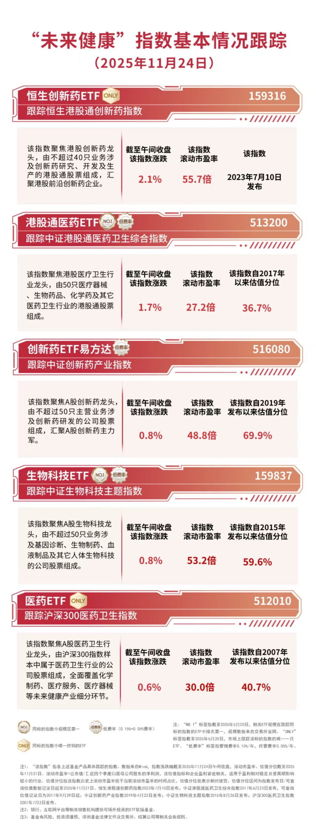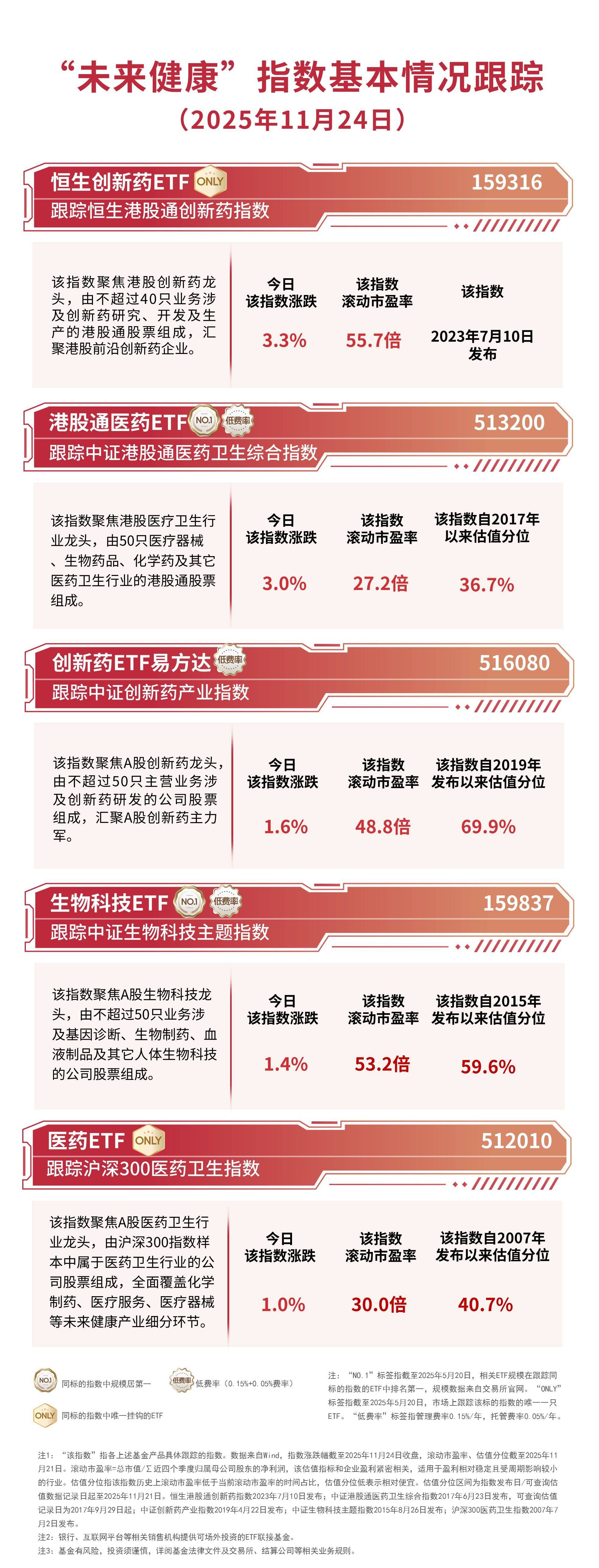 截至收盘,恒生港股通创新药指数上涨3.3%,中证港股通医药卫生综合指数上涨3%,中证创新药产业指数上涨1.6%,中证生物科技主题指数上涨1.4%,沪 深300医药卫生指数上涨1%。 中信建投证券表示,中国医药产业已迈入"创新兑现+全球布局"的关键阶段,人口与内需基数、全产业链制造能力构成核心支撑,企业积极探索多元化的出 海路径。展望2026年,可以重点关注创新商业化、全球化突破、政策优化带来的新增量及行业并购整合的机遇。 1.6% 生物科技ETF (NO] 器踪中证生物科技术频指数 3.0% 取标十儿酒胶迪医药 上一示宣情数 该指数聚焦港股医疗卫生行 业龙头,由50只医疗器械 、生物药品、化学药及其它 医药卫生行业的港股通股票 组成。 �H 该指数涨跌 创新药ETF易方达得 跟踪中证创新药产业指数 该指数聚焦A股创新药龙头, 由不超过50只主营业务涉 及创新药研发的公司股票 组成,汇聚A股创新药主力 车。 �日 该指数涨跌 该指数聚焦A股生物科技龙 头,由不超过50只业务涉 及基因诊断、生物制药、血 液制品及其它人体生物科技 的公司股票组成。 �日 该指数涨跌 医药 ETF ONLY 跟踪沪深300医药卫生指 ...