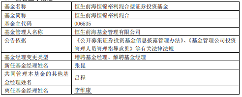 中国经济网北京6月24日讯 今日,恒生前海基金公告,恒生前海恒锦裕利混合增聘张昆。 张昆曾任恒生前海基金管理有限公司专户投资部投资经理助理,银泰证券有限责任公司固定收益部 投资经理,东吴基金管理有限公司固定收益部基金经理助理及债券研究员,东吴基金管理有限公司集中 交易部债券交易员,大成基金管理有限公司固定收益部债券交易员,现任恒生前海基金经理。 恒生前海恒锦裕利A/C成立于2019年3月20日,截至2025年6月23日,其今年来收益率为0.44%、 0.31%,成立来收益率为21.35%、21.21%,累计净值为1.2135元、1.2121元。 | 基金名称 | 恒生前海恒锦裕利混合型证券投资基金 | | --- | --- | | 基金简称 | 恒生前海恒锦裕利混合 | | 基金主代码 | 006535 | | 基金管理人名称 | 恒生前海基金管理有限公司 | | 公告依据 | 《公开募集证券投资基金信息披露管理办法》、《基金管理公司投资 | | | 管理人员管理指导意见》等有关法律法规 | | 基金经理变更类型 | 增聘基金经理、解聘基金经理 | | 新任基金经理姓名 | 张昆 | | 共同管理本基金的其 ...