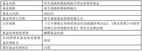 恒生前海恒锦裕利混合增聘张昆 李维康离任