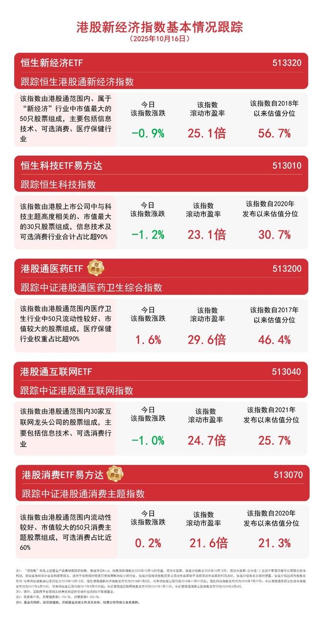 港股集体回调,截至午间收盘,中证港股通消费主题指数下跌0.9%,中证港股通医药卫生综合指数下跌1.3%,恒生港股通新经济指数、恒生科技指数均下 跌2.5%,中证港股通互联网指数下跌2.6%。Wind数据显示,恒生科技ETF易方达(513010)和港股通互联网ETF(513040)近期持续受资金关注 日,最新规模分别达224.7和53.5亿元,双双创下历史新高。 华泰证券指出,在美联储新一轮宽松周期开启、互联网及科技新一轮进展启动的背景下,港股情绪或仍有进一步改善空间,科技板块或依然处在布 港股新经济指数基本情况跟踪 (2025年10月10日) 恒生新经济ETF 跟踪恒生港股通新经济指数 该指数由港股通范围内、属于 "新经济"行业中市值最大的 50只股票组成,主要包括信息 技术、可选消费、医疗保健行 = 截至午间收盘 该指数涨跌 -2. 5% 该指数 滚动市盈率 26. 8倍 恒生科技ETF易方达 跟踪恒生科技指数 该指数由港股上市公司中与科 技主题高度相关的、市值最大 的30只股票组成,信息技术及 可选消费行业合计占比超90% 截至午间收盘 该指数涨跌 该指数 滚动市盈率 I 发 -2. 5% 24. 6倍 ...