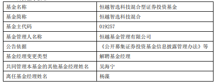 杨藻离任恒越智选科技混合 吴海宁管理