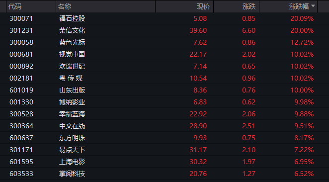Market Overview - The A-share market experienced an overall decline on October 31, with major indices showing slight decreases. The Shanghai Composite Index fell by 0.63%, the Shenzhen Component Index decreased by 0.62%, and the ChiNext Index dropped by 1.49% [3][2]. Sector Performance - The media sector led the market with a gain of over 3%, with several stocks hitting the daily limit up. Notable stocks included Fushi Holdings (300071) and Rongxin Culture (301231), both reaching a 20% increase [3][4]. - The biopharmaceutical sector also saw significant gains, with an increase close to 2%. Stocks such as Sanofi (688336) and Lianhuan Pharmaceutical (600513) also hit the daily limit up [3][5]. Notable Stocks - In the media sector, Fushi Holdings (300071) rose to 5.08, up by 0.85, a 20.09% increase, while Rongxin Culture (301231) reached 39.60, up by 6.60, a 20% increase [4]. - In the biopharmaceutical sector, Sanofi (688336) increased to 72.96, up by 12.16, a 20% increase, and Lianhuan Pharmaceutical (600513) rose to 21.77, up by 1.98, a 10.01% increase [5]. Declining Stocks - Several previously popular stocks, including Yizhong Tian (易中天), experienced significant declines. Notable drops included Xinyi Sheng (300502) down by 6.44% and Tianfu Communication (300394) down by 7.76% [7]. Hong Kong Market - The Hong Kong market also faced a downturn, with the Hang Seng Index approaching the 26,000-point mark. Stocks like SMIC and BYD saw notable declines, while New Oriental and AIA led the gains [8][9]. Company Announcement - Fosen Pharmaceutical's stock surged by over 80% during the session after announcing the approval of its "Enzalutamide Soft Capsule" for treating specific prostate cancer conditions. This product is expected to provide more treatment options for adult patients [9][10].