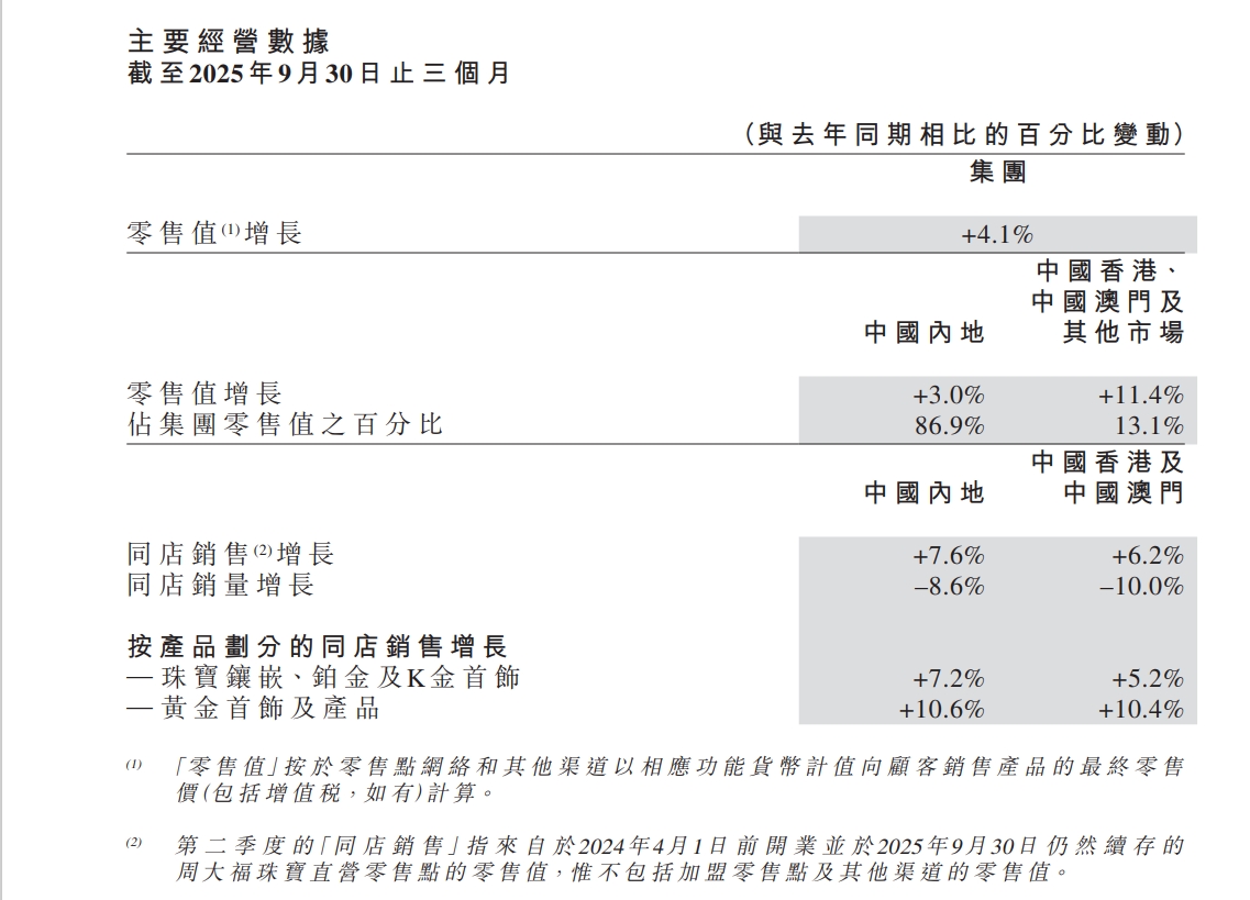 Group 1 - The core viewpoint of the article highlights that Chow Tai Fook has experienced a significant increase in retail value for its gold products, driven by rising gold prices, with a reported growth of 4.1% in retail value for the second quarter ending September 30, 2025, and a remarkable 43.7% increase in retail value for priced gold products [1] - The company reported a positive same-store sales growth of 7.6% for its direct stores in mainland China and 8.6% for franchise stores, while same-store sales in Hong Kong and Macau grew by 6.2%, with Macau showing a strong increase of 17.3% [1] - Despite the increase in retail value, the overall sales volume has declined, with a reported drop of 8.6% in same-store sales volume in mainland China and a 10% decline in Hong Kong and Macau [1] Group 2 - Chow Tai Fook and other brands have raised their gold jewelry prices, with the current price set at 1279 yuan per gram, and investment gold bars priced at 1138 yuan per gram, reflecting a daily increase of 32 yuan [1][2] - The company plans to announce product price adjustment information as early as next week [3]